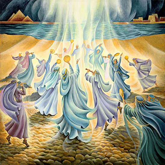 One of the roles of Miriam was to teach and instruct the women. She was the first leader whose mission was to teach the women. She circulated among the women, and by her presence created a holy atmosphere. She instructed them not so much by words but by character–by her actions. When Miriam took the drums they followed her. She didn’t ask them to follow. She went and they followed. Just think about it. It could have been any of us here today: Devorah or Chava Rachel, Tzionna, Joy, Mirele, Debby, Yehudit, Aviva or Joanie, following her into the river bed with Pharoah’s army chasing us with chariots, walls of tumultuous roaring waters piling up on either side. There we were, singing the oldest of all national anthems, “Sing unto HaShem.” All the centuries of bondage in Egypt were lifted. The sound of thundering gushing waters accompanied by drums and tambourines and the beautiful and holy voices of the redeemed women of Israel. She used her great gift of music to elevate her people, to exult over their escape from their enemies, to give them a newly discovered faith and love of HaShem. Miriam knew that it would be easier for “Am Israel” to go through the Red Sea if they danced and sang songs of redemption.
